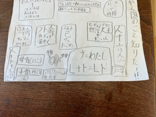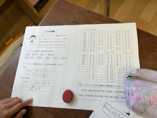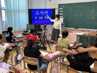 今日は、ソンセンニムに来ていただき、日本と最も身近な国である韓国朝鮮について学習しました。「アンニョンハセヨ」と挨拶をしてから、クイズに挑戦しました。算数のことをサンス、教室はキョシル、時間はシガンと呼ぶことを知り、日本語と似ているので驚いていました。次に、ハングル講座ということで、自分の名前をハングルで書くとどうなるのかを教えてもらいました。最後には、ハングルで書かれたソンセンニムからの秘密の手紙を自分たちだけで読みました。子どもたちは、解読するスピードがとても早く驚かされました。