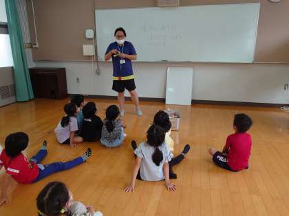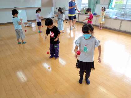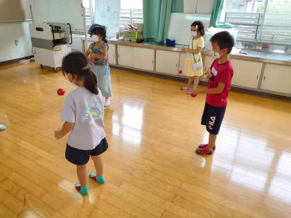また、けん玉では、大皿にのせることを目標にして遊びました。以前にけん玉遊びをしたことがあった子もいて、友だちに教える姿も見られました。
