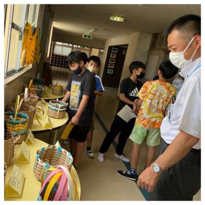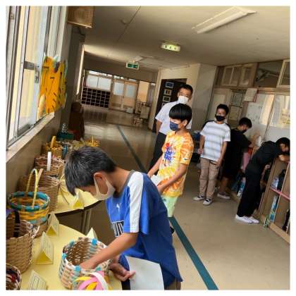 図画工作科では完成した『あみあみアミーゴ』の鑑賞会をしました。鑑賞していると校長先生の姿が!!