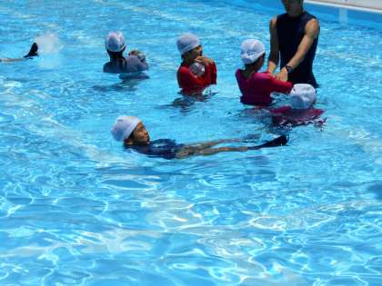 今日は着衣泳をしました。服を着て水に入ったときの服の重さや、泳ぎにくさを体験しました。そしてどのように対処すればよいのかを学習しました。