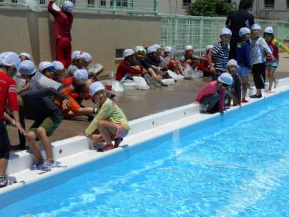 子どもたちは、「服が体にくっついた」や「歩きにくい」など体感して学んでいたようです。そして身近にあるペットボトルを使って、浮く活動をしました。もしも水の中で溺れてしまったときには「浮くこと」がとても大切です!!