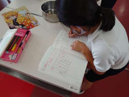 グループで協力しながら、何リットル、何デシリットルになるかしっかり調べ、記録していました。