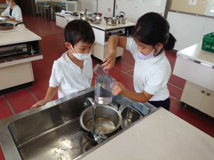 フライパンやなべ、食器に水を入れて、マスにうつしかえて水のかさがいくらになるかグループで調べました。
