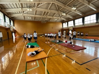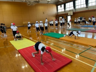 3、4年生合同でとび箱の特別授業がありました。クマ歩きやうさぎ跳びなどの感覚づくり運動をした後、開脚跳びと台上前転のやり方を教えてもらいました。コース別で教えてもらい、跳び箱が得意な子も苦手な子も楽しみながら学習することができました。