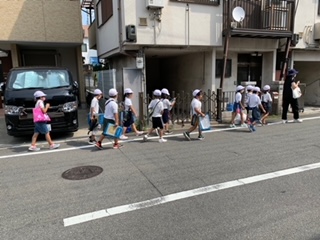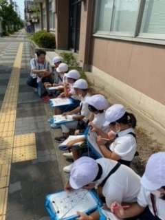 生活科の学習で、町探検に行きました。生江校区内を歩きながら、校区にあるお店や会社、標識などを探してメモしていきました。暑さにもまけず、子どもたちはたくさんみつけていましたよ。