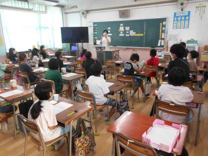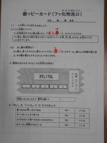 初めに、教室でむし歯予防について歯科衛生士から保健指導(ハッピーカードの内容)がありました。