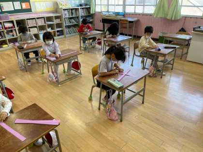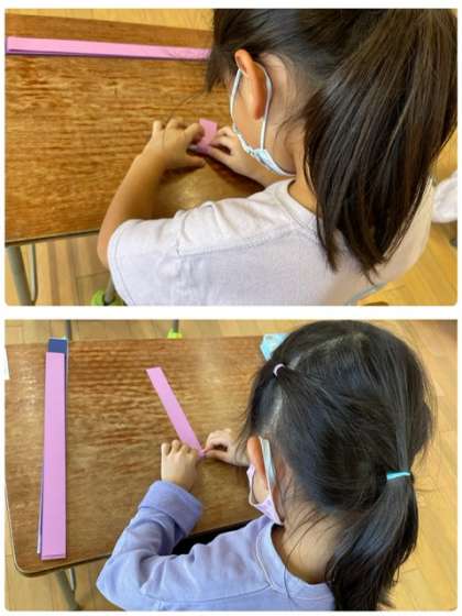 細い紙をえんぴつにくるくる巻いて、ボンドに貼ると完成です。みんな職人のように画用紙を丸めていました。美味しそうなぶどうが完成しました。