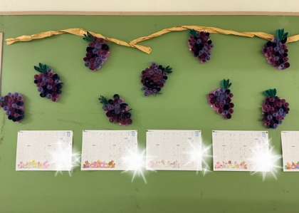 季節はすっかり秋になりました。先週の校外学習でもお弁当に入っている子が多かった「ぶどう」を画用紙で作りました。