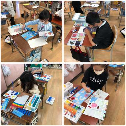 今日は、白板に絵の具で色を塗りました。水の量の調節が難しそうでしたが、みんな上手にぬれていました。次は、楽しみにしているくぎ打ちをしていきます。安全に金づちを使って、くぎを打っていきましょう。