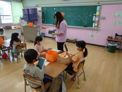 画用紙をはさみで切ったり、のりで貼ったりしながら楽しく活動していました。どんな飾りにしようか考えながら、絵を描いたり、色を塗ったりしている姿が見られました。
