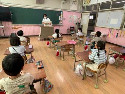 初めての栄養指導のめあては「すききらいしないでたべよう」です。自分の苦手な食べ物にも、からだをつくるはたらきや、ちょうしをととのえるはたらき、エネルギーのもとになるものなど成長するのに大切なことがたくさんあることがわかりました。