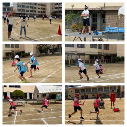 洗い立てのゼッケンをつけて、今日の体育はリレーのバトンパスの練習をしました!!