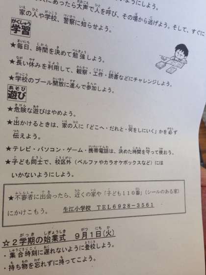 ついつい開放的になり、普段行かない所に子どもだけで行ったり、たくさんお金を持って遊びに行ったりすることがないようにご家庭で是非話をしておいてください。