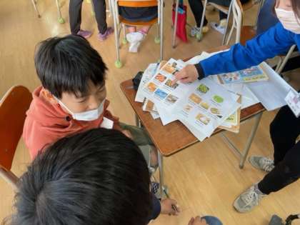 そして、似たようなカレーを作っているメンバーでチームを作り、オリジナルカレーを作ります。チラシを見て、どの食材を使うのかみんなで話し合います。カレーのネーミングも自分たちで考えます。