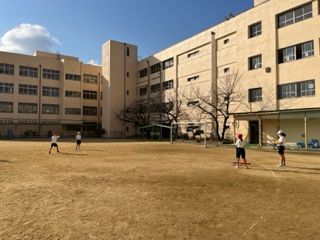 体育の学習でグループごとに考えたルールで、ティーボールをしています。どのグループのルールも楽しくゲームができたのですが、もっとこうした方がいいのではないかという課題もたくさん見つかりました。