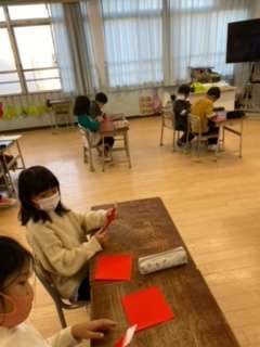 朝のモジュールの時間にひさこ先生がいらっしゃり、一緒にサンタさんの折り紙をしました。色を英語で言って折り紙を選びました。可愛いサンタさんがたくさんできました。