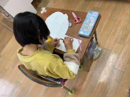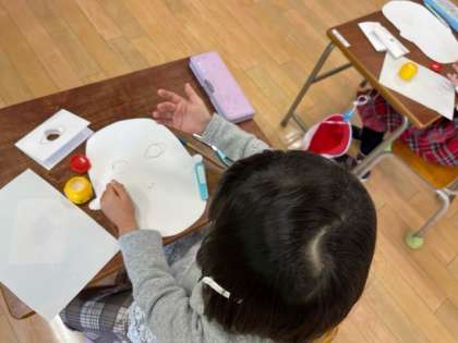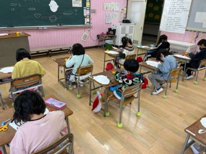図画工作科では紙版画に取り組んでいます。テーマは「はいっチーズ」にっこり笑った自分の顔です。輪郭、耳、目…今週はついに、口と髪の毛を作っています。自分の顔の出来上がりが近づいてきて、細かい作業も集中して頑張っています。