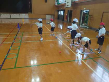 ボッチャのボールの感触を確かめながら、床に置いている輪っかの中に入れるためにはどうしたら良いか、力加減を考えながらボールを投げていました。
