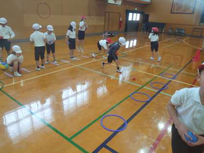 ボールの投げ方も上手で、床に置かれた輪を目指して、力加減を考えて投げることができていました。