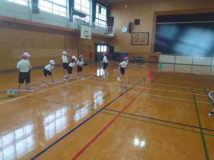 輪の距離が遠くになっても、どうしたら輪の中にボールを入れることができるか考えて、プレーを楽しむ様子が見られました。