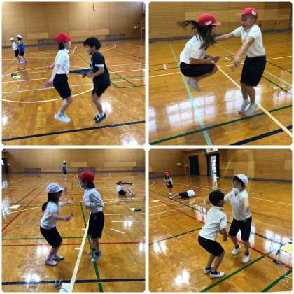 雨だったので、講堂でなわとびをしました。短縄ですが、2人跳びに挑戦しました。どのペアも声をかけ合って、一緒に跳ぶことができました。