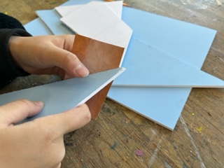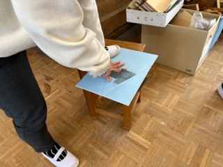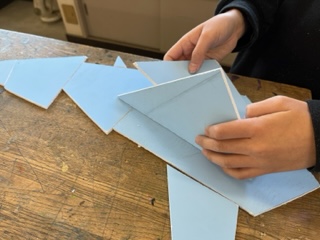 板に直線を引き、線と線が交わるようにしていろいろな形をつくりました。その形をのこぎりで切って組み合わせていきます。どんな作品ができるのか楽しみです。