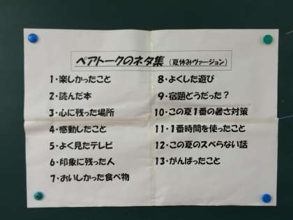 6年生は、始業式の後、夏休みの思い出をペアで話していきました。1分交代で話をしていきましたが、時間が全然足りない様子でした。話し切れないくらい楽しい夏休みを過ごしたのですね!その後の活動もテキパキとこなし、とても素晴らしかったです。