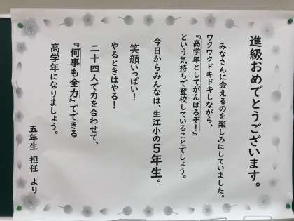 ウキウキワクワクの新学期が始まりました。今年度から、3階の教室になり、高学年として、下級生を引っ張ってくれることを信じています。また、子どもたちのやる気に満ちあふれた顔を見れて、とてもほっとしました。