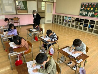 先生の話をよく聞いて、一生懸命にひらがなを練習する姿が見られています。
