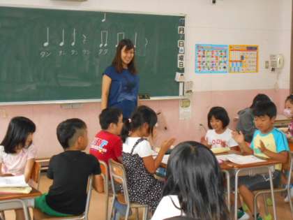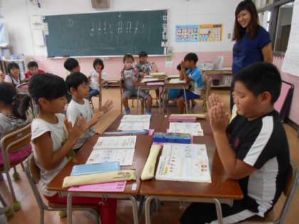 リズムを作って、作ったリズムを手でたたく、という授業でした。作ったリズムをグループで手をたたいて、音楽を作ります。子どもたちは、リズムよくいろんな音を作ってたたくことができました。「タン、タ、タン」「タン・・・タン、タン」どんなリズムもすんなりとできるようになって感心しました。