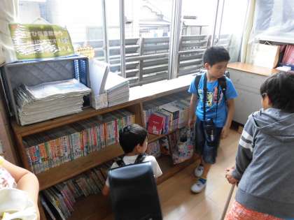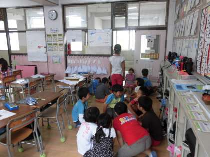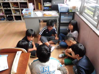 今日は、みんな遊び係の初仕事。あいにくの雨だったので、教室でものまねしりとりをしました。しりとりで言ったものをまねして次にまわす、というルールで見ていてとてもおもしろく、どの班も盛り上がっていました。