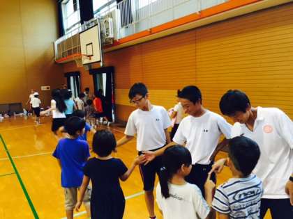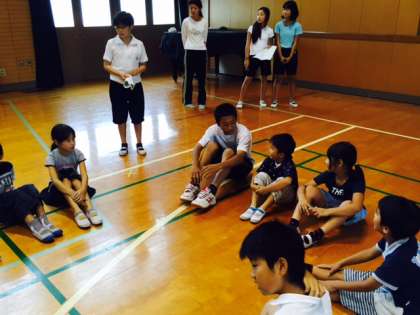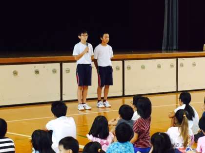 集会の時間には、全校児童の前で自己紹介をしました。その後、一緒に集会に参加し、最後にはみんなでタッチをして終わりました。