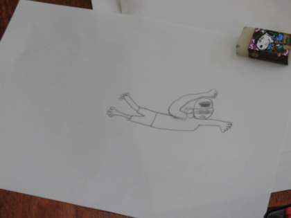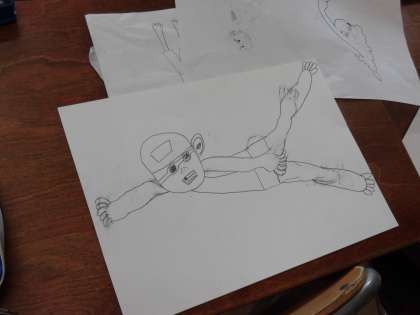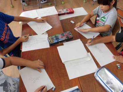 水中からの絵、前からの絵、横からの絵を更紙に何度も練習しました。最初は体のバランスがうまくかけなくて、なんともいえない絵が多かったですが、コツを聞いたり、練習するうちにだんだんかけるようになってきました。今は、画用紙に本番でかいていますが、すっかりコツをつかんでいました。