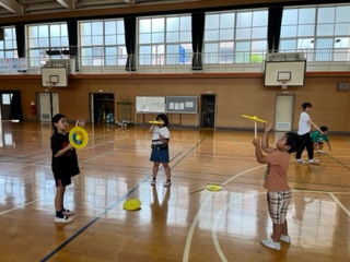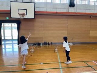 日本のこまによく似たペンイという遊びや離れた場所から矢を投げて、壺に入れるトゥホという遊びなど5種類の遊びを体験しました。中でも、ポナという皿回しのような遊びが一番人気でした。日本の遊びとよく似た遊びがあることを知り、おとなりの国を少し身近に感じたようでした。