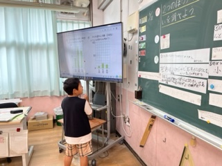算数で、ぼうグラフについて学習しています。今日は、二つのぼうグラフのちがいについて考えました。同じ数を表したグラフでも、1目盛りの大きさが変わると、読み取りやすさも変わることに気づいていました。