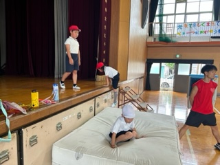 クモ歩きやクマ歩き、セイウチ歩きなどの動物の動きをマネした運動をしたり、舞台からジャンプしたりしました。前ころがりや後ろころがりにも意欲的に練習していました。