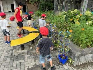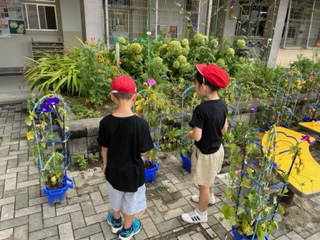 今日もきれいな花がたくさん咲いていました。そして、アサガオの実もできていたので、朝の観察の時間に種とりをしました。