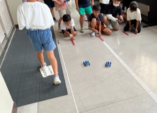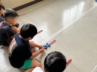 5cmと10cmにのばしたゴムで実験をすると、車が動いた距離に大きな違いが出ました。「ゴムってすごい」という声がたくさん聞こえてきました。