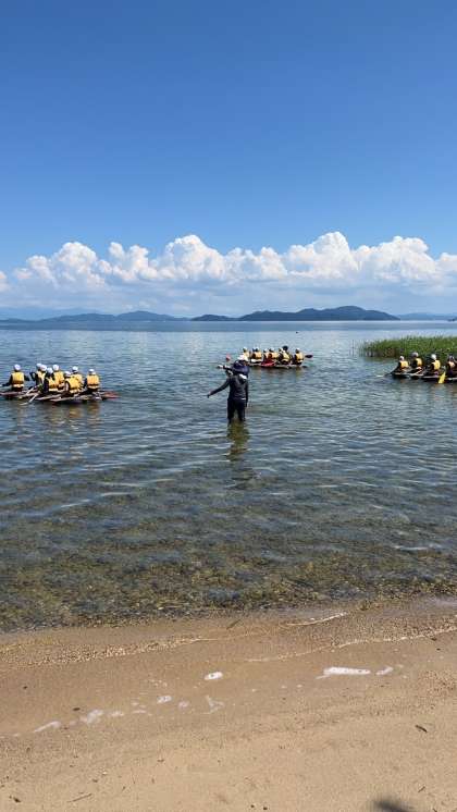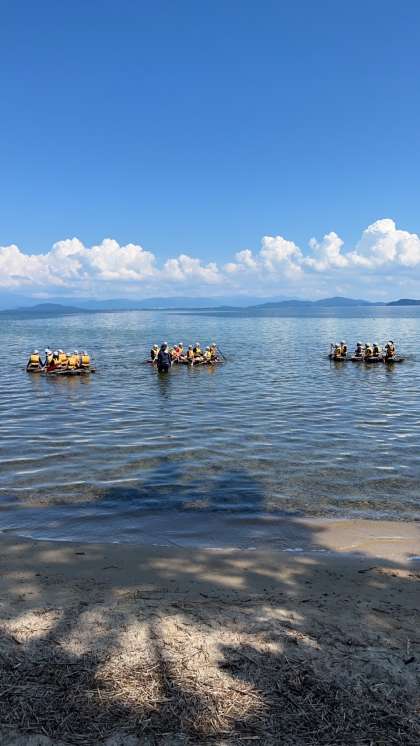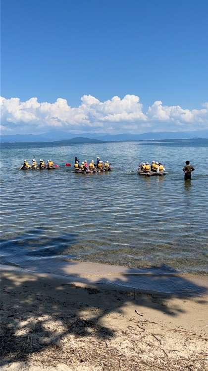 イカダ完成です。子どもたちは元気にオール片手にイカダに乗りこみました。乗った子どもたちの感想は・・・。お家に帰ってきたら聞いてみてください。