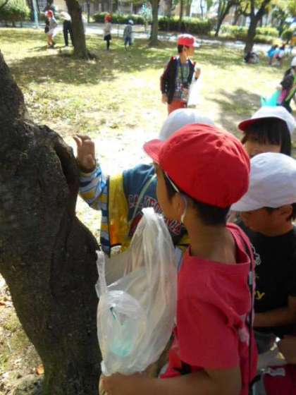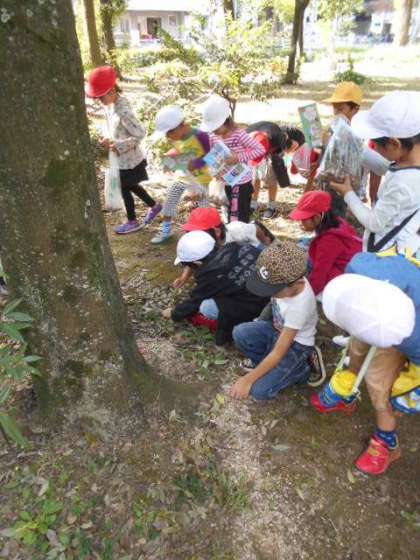 今日は城北公園にどんぐりひろいにいきました。クヌギやアラカシといったどんぐりの木があります。前日にどんぐりについて学び、どれぐらい落ちているかな〜とわくわくしていくと・・・山ほど落ちていてみんな大喜び!まあるいクヌギのどんぐりが特に多かったです。
