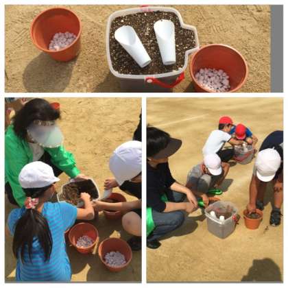 土は、地域の方が作ってくださっていて、子どもたちは鉢にお土を詰めることから始めました。そして、種を植えるときには、「小さい種やなぁー」「あ、なくなった!」といいながら植えていきました。