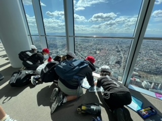 あべのハルカスに行きました。まず、16階まで上がり庭園で景色を楽しみました。この段階でかなり驚いていた子どもたちでしたが、60階に到着すると「すごーい」「全部小さく見える」と予想を上回る高さに、更に驚いたようでした。それから、一時間程時間をかけて、東西南北それぞれの方向を見て、何が見えるのか、しっかり記録していました。その後、てんしばへ移動し、楽しみにしていたお弁当を食べました。学校に帰ってからは、環状線を一周して見えたものや気付いたことをワークシートにまとめました。かなり疲れたようでしたが、充実した社会見学となりました。