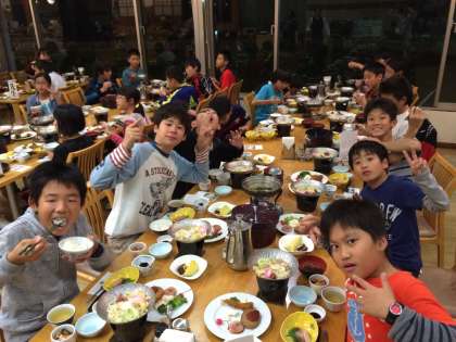 テーブルには豪華な食事の数々!「いただきます!」をした後、班ごとに食べて行きました。ご飯をおかわりする子がとても多かったです。