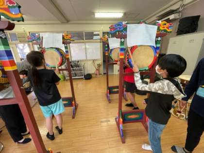 今日の国際クラブでは、発表会に向けて、引き続き、ヤンミョンブク(両面太鼓)の練習を行いました。