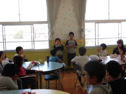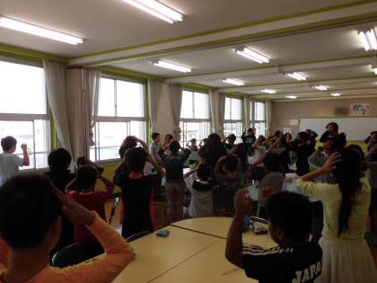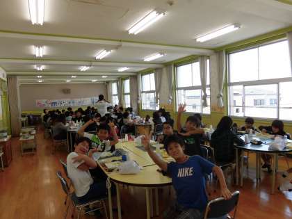 食べる前からにぎやかな話し声が聞こえており、給食中も楽しそうな笑い声や笑顔があふれていました。給食後は、6年生による「ものまねゲーム」。代表がやった動きをみんなが真似をするゲームです。最初は簡単な動きから始まり、動きの数が増えてきて難しくなってきても子どもたちはみんなしっかり覚えて真似していました。ユニークな動きもあり、最高の盛り上がりでした!