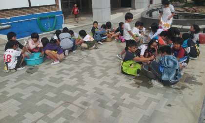 汚れた洗濯物を持ち寄り、たらいで手洗いしました。
