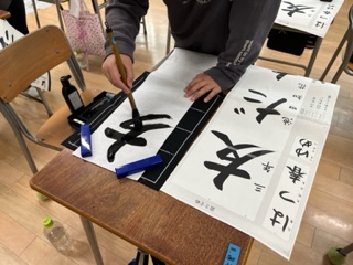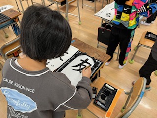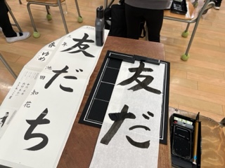 今回 3年生が書いたのは、「友だち」です。半紙が長いため、机を縦にして立って書きました。 3文字の間隔に気を付けながら、集中して書くことができました。