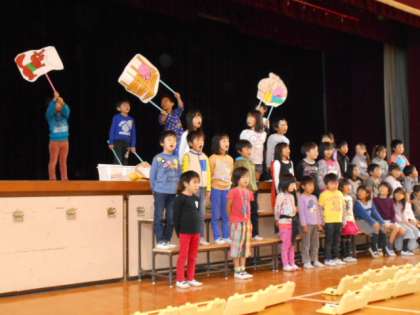 今日の集会は1,2年生による歌声集会でした。テーマは『お話を歌で歌おう。』です。