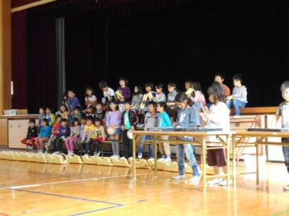 そのあとに、1年生は『きらきらぼし』を、2年生は『山のポルカ』を演奏しました。1年生は鍵盤ハーモニカを始めたところですが、始めたばかりとは思えないほど上手に弾いていました。2年生は、鍵盤ハーモニカ、鉄琴、木琴、それぞれの楽器が2拍子のリズムに合わせて合奏をしました。とてもきれいなハーモニーになりました。
