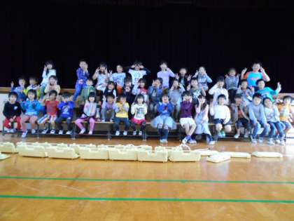 アンコールをいただいたので、『おおさかうまいもんのうた』を振りつきで歌いました。かわいい振りにとっても大盛り上がりで、2回目は1〜6年生全員で歌いました。